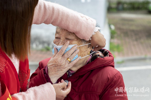 为老年人戴好口罩。
