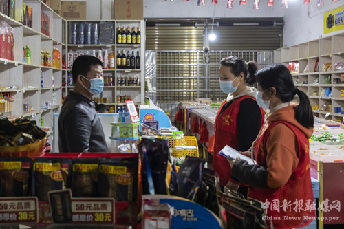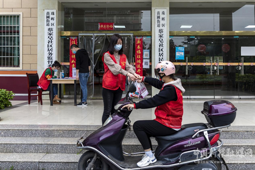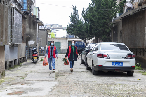 下午3:00,蔡家皂社区工作人员上门为一名居家隔离的居民送生活物资。