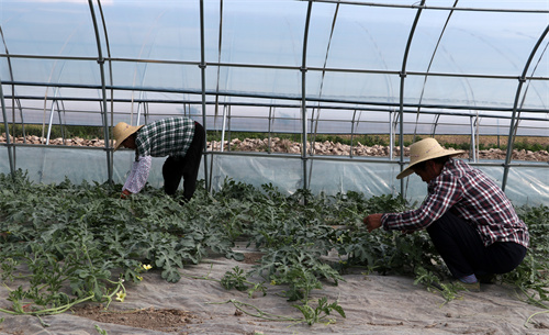 2022年4月24日,安徽省合肥市庐江台创园连河村孔静心种植家庭农场,村民正在为大棚早西瓜进行清理杂草、打岔理蔓。