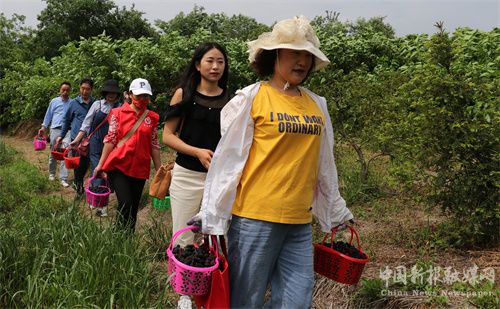 2022年4月27日,安徽省合肥市庐江县冶父山镇明圣村的七彩果园里,满树桑葚乌黑亮紫,游客们钻进桑园一饱口福,体味童年的记忆。