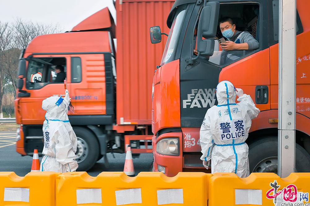 2月22日, 由于高速管控实行管控,苏州工业园区交警大队辅警黄靖雅、杨玉燕在沪宁高速园区出入口检查苏城码。嘉诚摄影