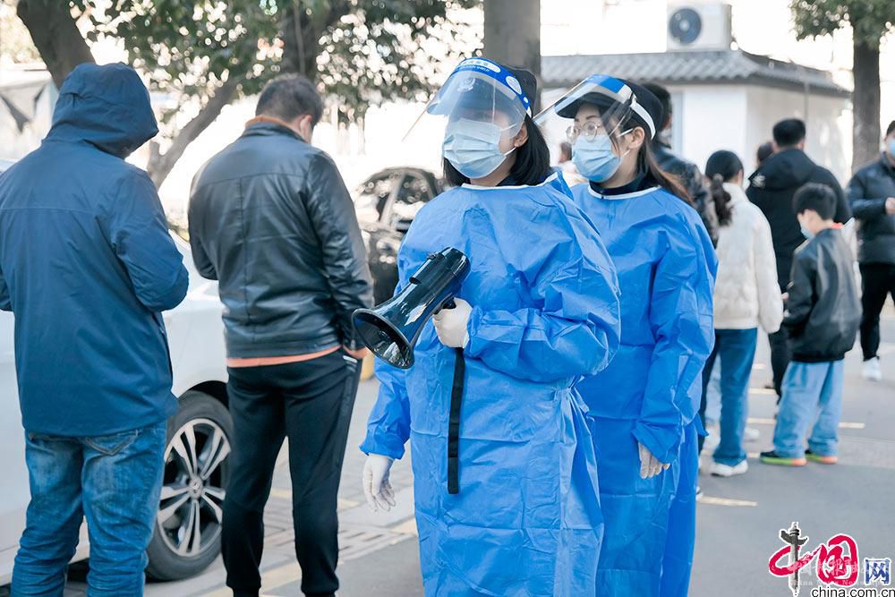 2月24日, 苏州姑苏区里河新村核酸检测,葑门派出所海棠红先锋队王慧芬警官在维护秩序。嘉诚摄影