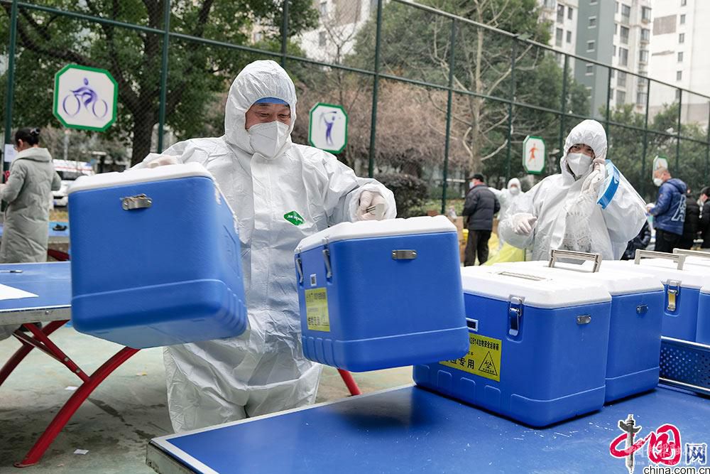 2月16日,苏州高新区浒墅关镇某小区核酸检测,志愿者准备将核酸检测样本装车送至检测实验室。嘉诚摄影