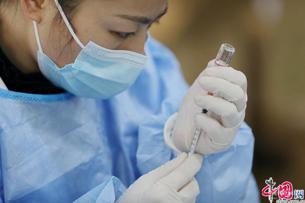 3月3日,安徽农业大学体育馆内,蜀山区琥珀街道社会事务部设置新冠疫苗接种专场,医务人员正在准备新冠疫苗。陈三虎摄影