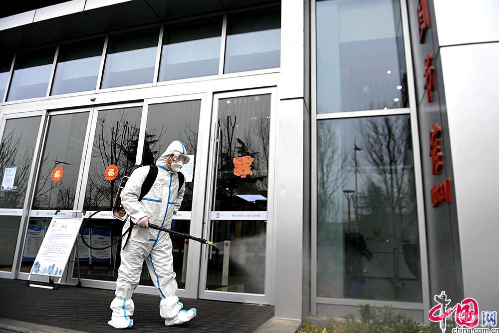 3月13日,山东青岛西海岸新区市民文化中心(东区),通达救援队队员在室外进行消杀。俞方平摄影