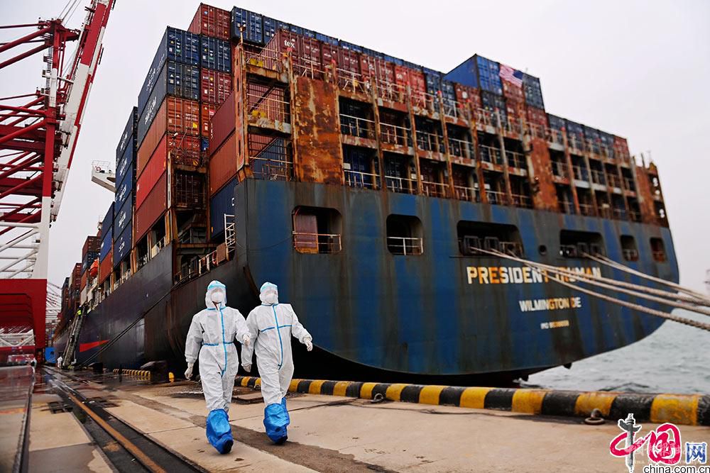 3月17日,山东黄岛出入境边防检查站集装箱码头,执勤一队民警在码头巡逻。俞方平摄影