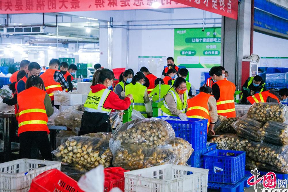 3月29日,苏州高新区狮山街道食行生鲜总部发送蔬菜物资到上海,车间工作人员包装蔬菜。嘉诚摄影