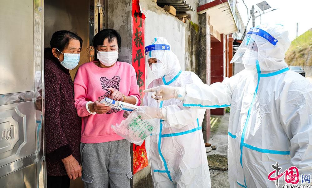 3月29日,江西省瑞昌市湓城街道社区干部及志愿者为居家隔离市民送药上门。魏东升摄影