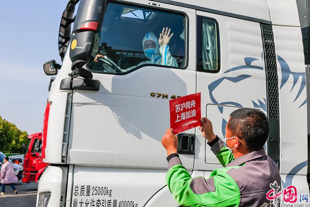 3月29日,苏州高新区狮山街道食行生鲜总部发送蔬菜物资到上海,当天总运输车辆18辆次,装卸师傅给司机加油。嘉诚摄影