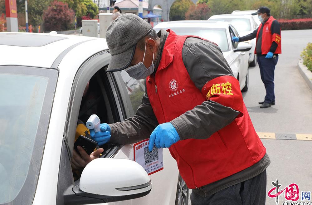 4月4日,安徽省合肥市蜀山区小庙镇枣林小区入口处,蜀山区机关企事业单位工作人员和志愿者通过查验健康码、行程码,筑牢农村疫情防控坚固防线。陈三虎摄影