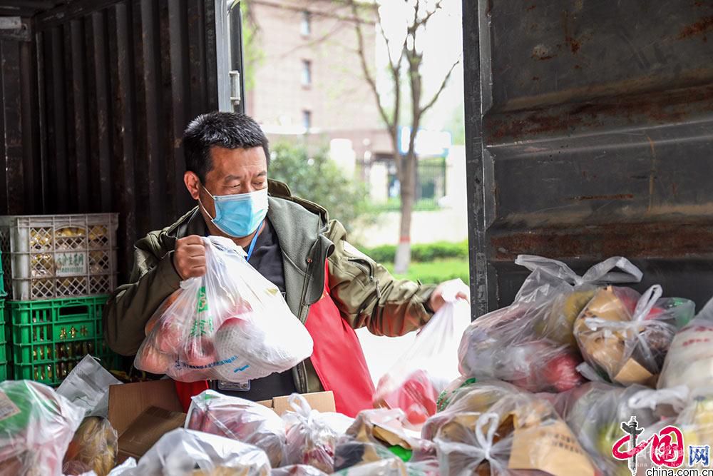 4月12日,邯郸市丛台区联西街道办事处警校社区支部书记井振军在为封控小区居民准备蔬菜包。李铭骥摄影
