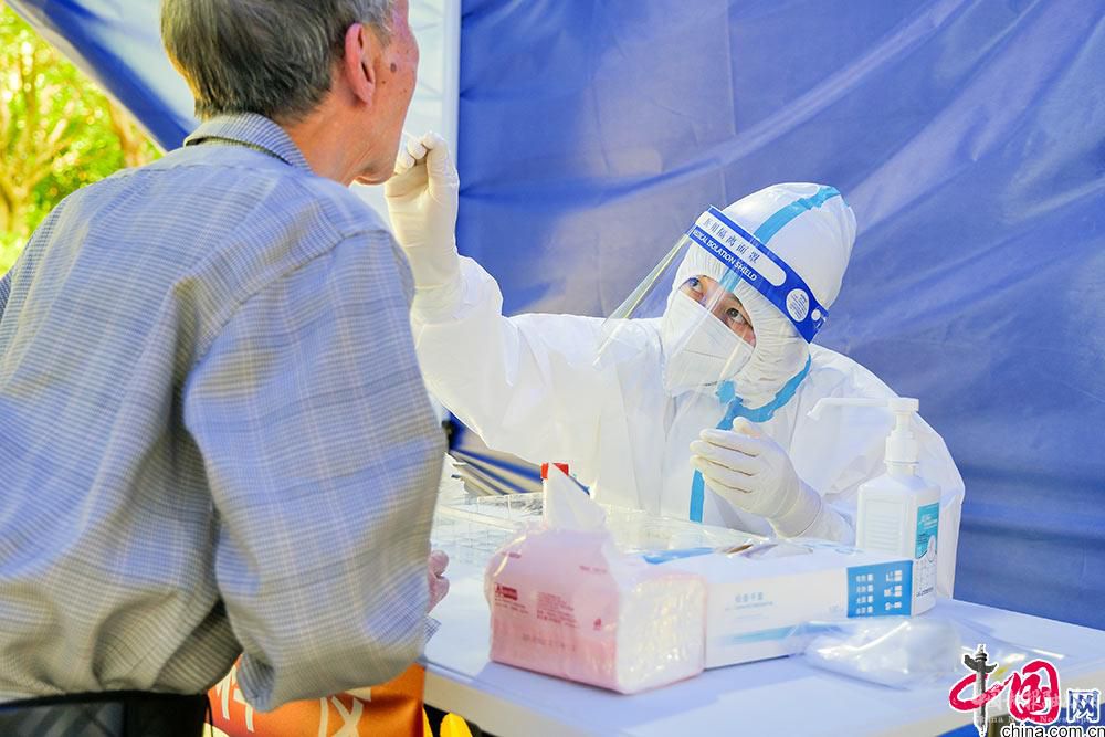 4月12日,医护人员在为苏州高新区狮山街道某小区(尚悦湾)辖区内居民核酸检测 。嘉诚摄影