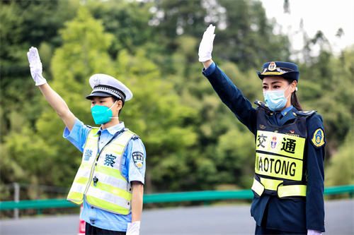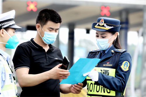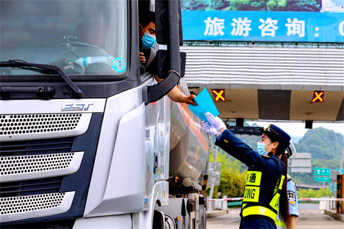 5月8日,在黄祁高速公路安徽休宁收费站下口,安徽省黄山市交通运输综合行政执法支队直属一大队执法人员,正向过往司乘人员宣传相关公路法律法规内容、保通保畅政策。