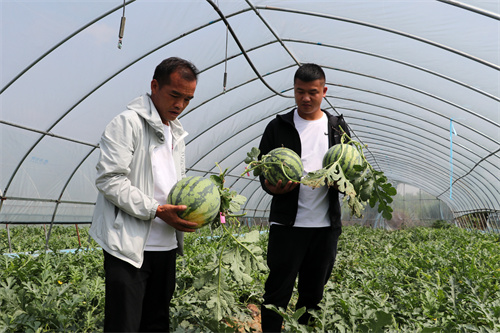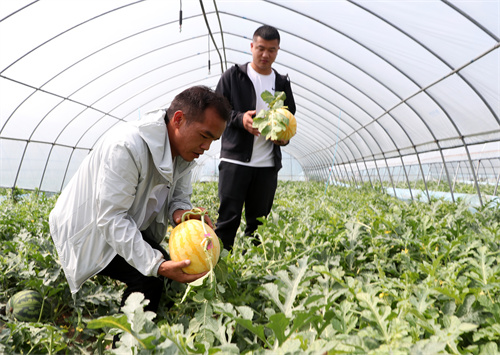 2022年5月13日,在安徽省示范家庭农场——合肥市庐江县冶父山镇孟祥海家庭农场,负责人孟祥海正在和伙伴一起采收成熟的西瓜。