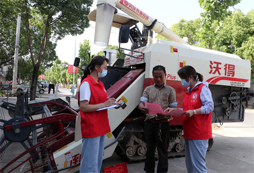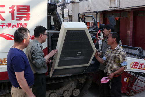 2022年5月23日,安徽省合肥市庐江县石头镇三拐村大田小麦收割现场,县农业农村局派出技术人员深入田间地头及各农机销售网点、农机合作社,免费上门检测收割机安全,及时排查隐患问题。