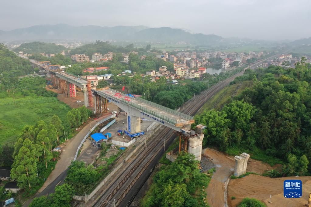 完成转体的南玉高铁跨黎湛铁路特大桥转体梁(5月24日摄,无人机照片)。