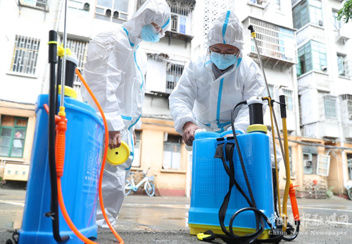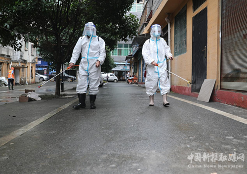 5月31日,在衡阳市珠晖区广东路街道上溪社区,南华大学公共卫生学院的志愿者在开展防疫消杀工作。