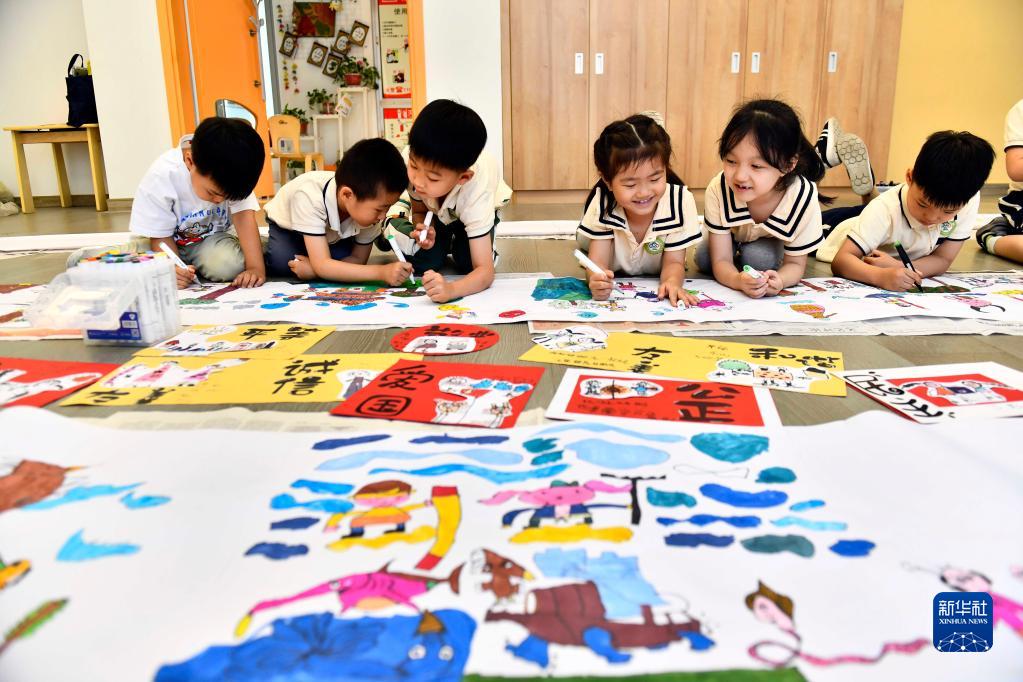 5月30日,在山东省实验幼儿园,孩子们在手绘《西游记》图画。