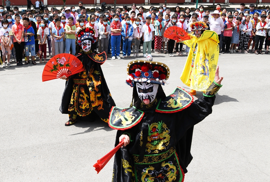 5月31日,山东省枣庄市山亭区徐庄镇中心小学,学生们表演川剧变脸。李宗宪 摄