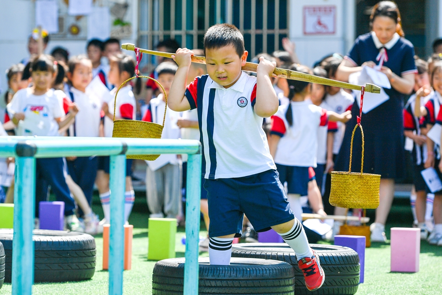 5月31日,浙江省湖州市长兴县小浦镇中心幼儿园,小朋友参与障碍挑扁担趣味运动项目。谭云俸 摄