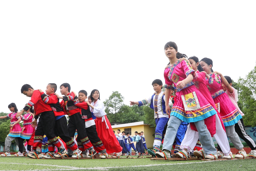 5月30日,江西省宜春市上高县敖山中心小学,少数民族学生们身着盛装,玩踏板游戏。陈旗海 摄