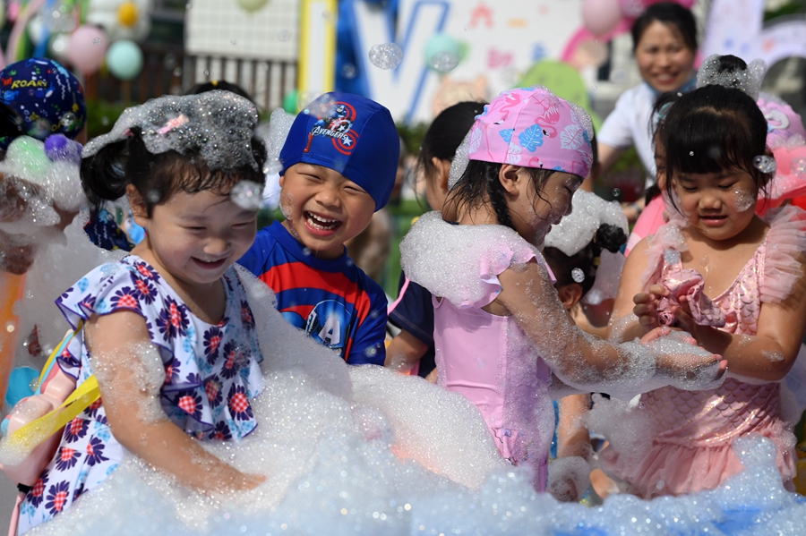5月31日,四川省内江市东兴区阳光幼儿园,小朋友们玩泡泡。兰自涛 摄