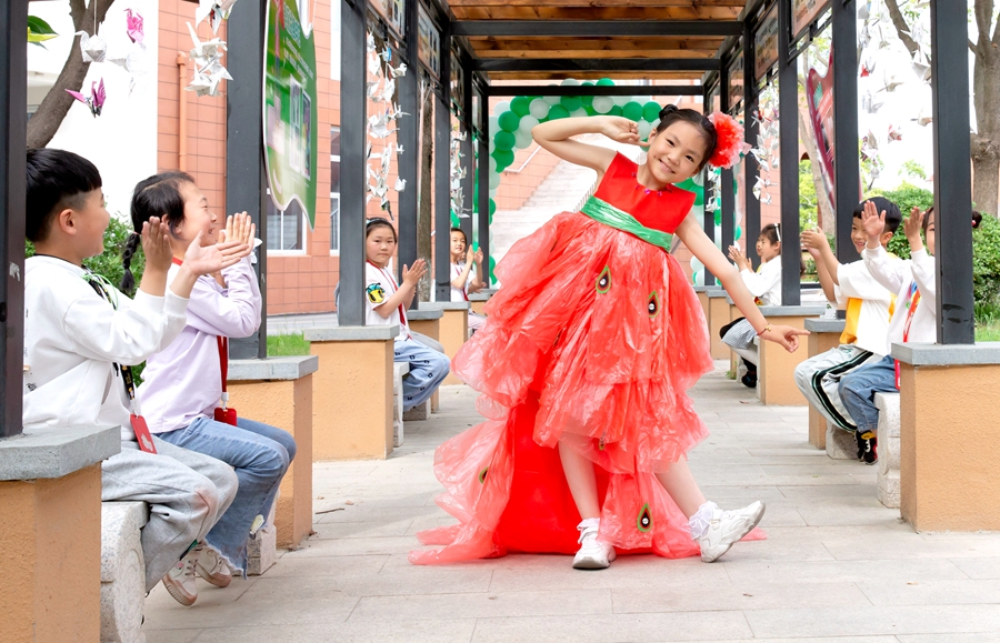 5月31日,江苏省海安市城南实验小学东校区,学生们举行环保时装秀。向中林 摄