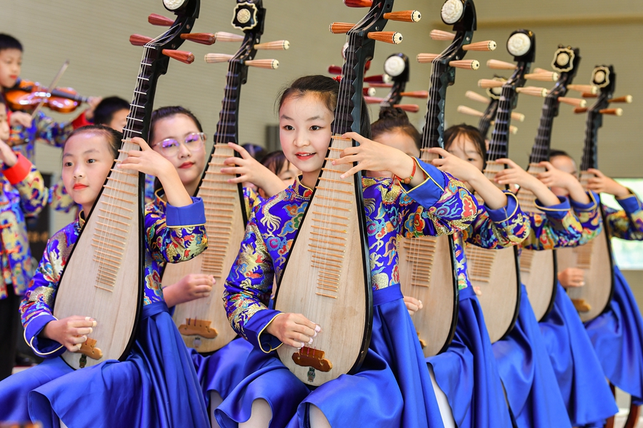 5月31日,安徽省合肥市建平实验小学南艳分校,学生们表演琵琶合奏。袁兵 摄