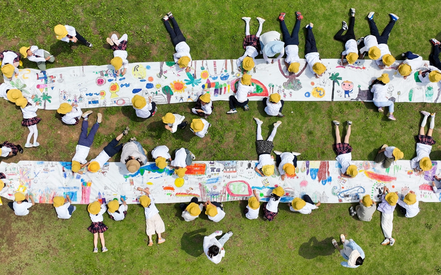 5月31日,浙江省湖州市德清县武康街道机关幼儿园,小朋友们在画卷上绘画。王正 摄