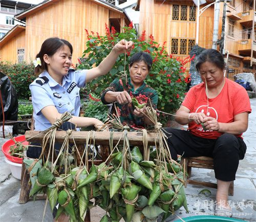 6月2日,民警在湖南省保靖县比耳镇比耳村与留守人包粽子喜迎端午。端午佳节来临之际,该县公安局组织民辅警进村入寨,开展“迎端午、警民亲”主题活动,与群众一起包粽子、拉家常、话情谊,共同感受浓浓的中华民族传统节日文化。(俞采华 石 磊)