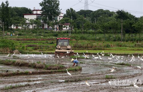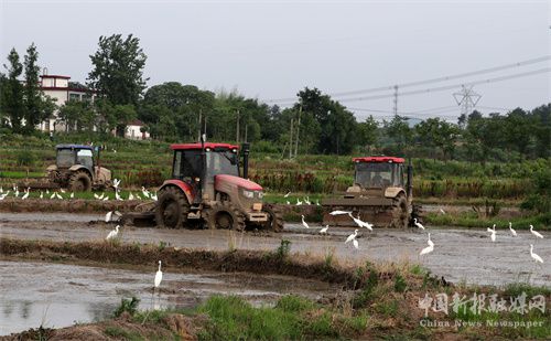 2022年6月11日,安徽省合肥市庐江县冶父山镇安权家庭农场,几台大型机械正在大田里旋耕以备栽插一季稻秧苗,千百只白鹭、灰喜鹊、黑水鸡等鸟儿围着机械翩然起舞,嬉戏觅食。