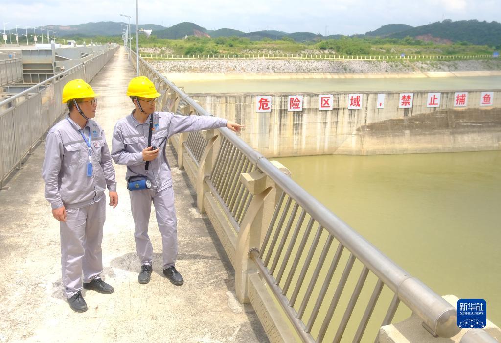 6月21日,工作人员在位于邕江上的广西南宁市邕宁水利枢纽工程拦河大坝进行安全巡查。