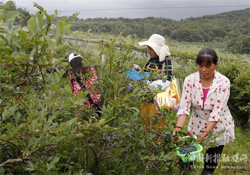 该基地以绿色种植模式在当地中型水库张院水库沿岸荒坡上选种奥尼尔、薄雾、莱克西、威五等优质蓝莓品种渐次成熟,蓝莓产业园年可收蓝莓1万多公斤,亩产值达2.5万元。他们以“党支部+合作社+村民”的模式,通过就近务工和土地、资金参股分红的模式,带动周边30多名村民增加收入,人均年增收2万多元。 (巢志斌 摄影报道)