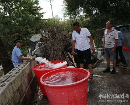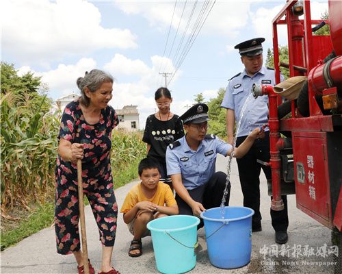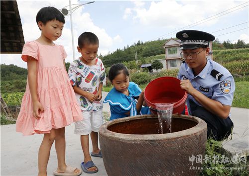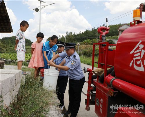 8月19日,湖南省保靖县公安局清水坪派出所的民警在清水坪镇大坪村给村民送生活用水。连日来,受持续高温天气影响,旱情持续,当地部分山区群众日常生活用水困难,该县公安局组织民警快速投入“保民生、解民忧,抗旱送水”行动中,以缓解农民饮水困难。(俞采华 张昌峰)