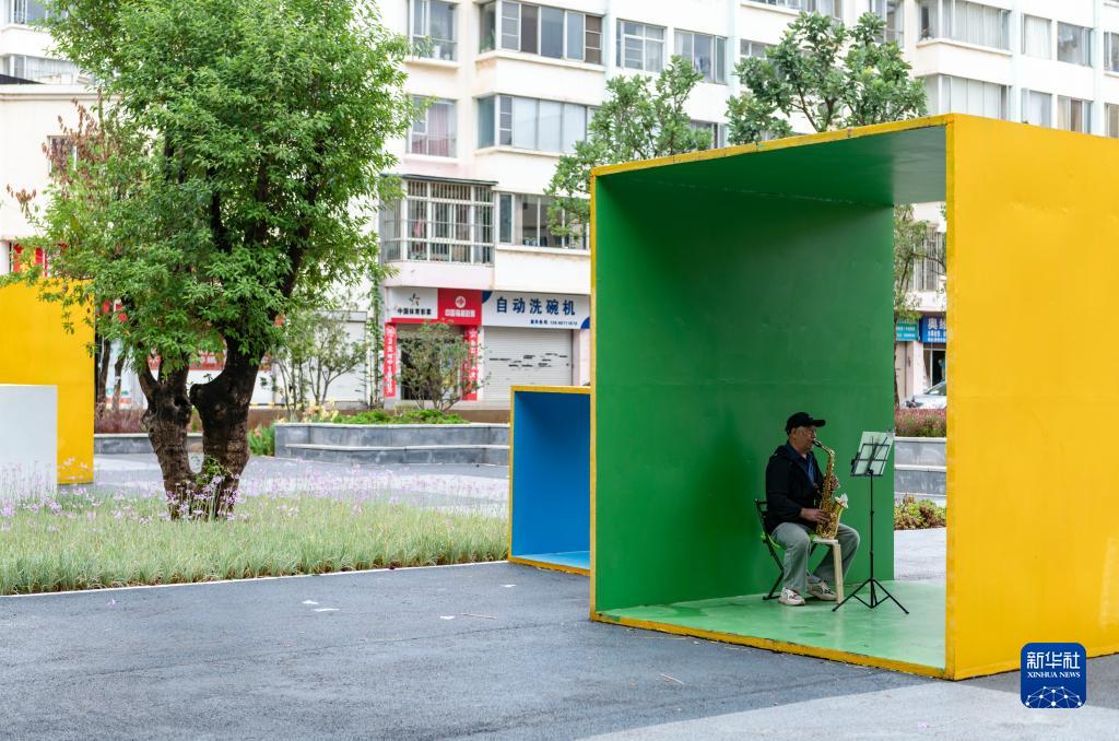 9月1日,市民在昆明广福小游园内吹萨克斯。