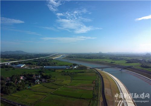 2022年9月8日, 航拍下的安徽省合肥市庐江县柯坦镇境内的引江济淮雄姿,在清晨秋阳映照下,河水清清,一路向北。