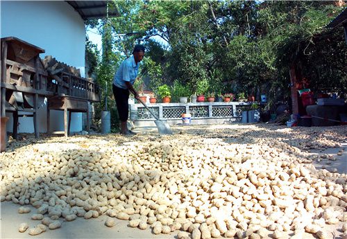 2022年9月9日,在安徽省合肥市庐江县乐桥镇杨岗村村头,村民在自家房前屋后空地晾晒芝麻、花生、玉米等秋季作物。