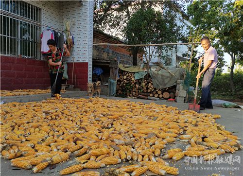 杨岗村村民有在边坡旱地种植玉米、芝麻、花生、豆类等作物的传统习俗,当前正值秋收季节,村民们抢抓初秋时节晴好天气,将收获的秋季作物进行晾晒。 (巢志斌 摄影报道)