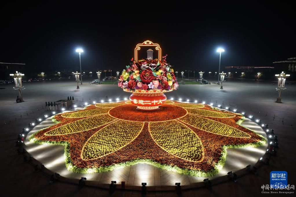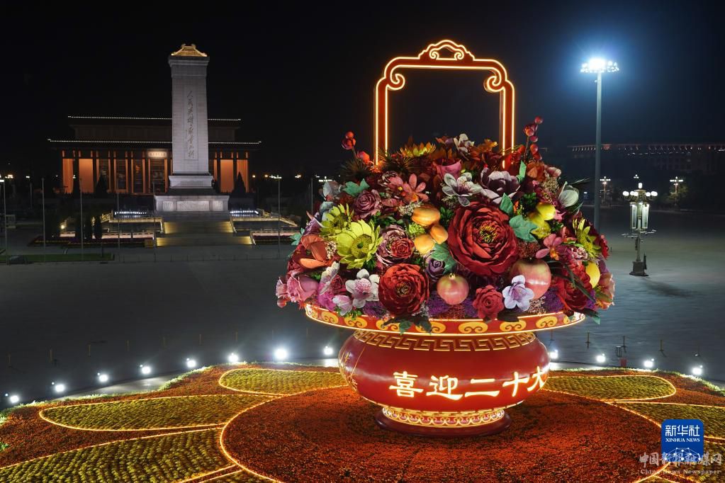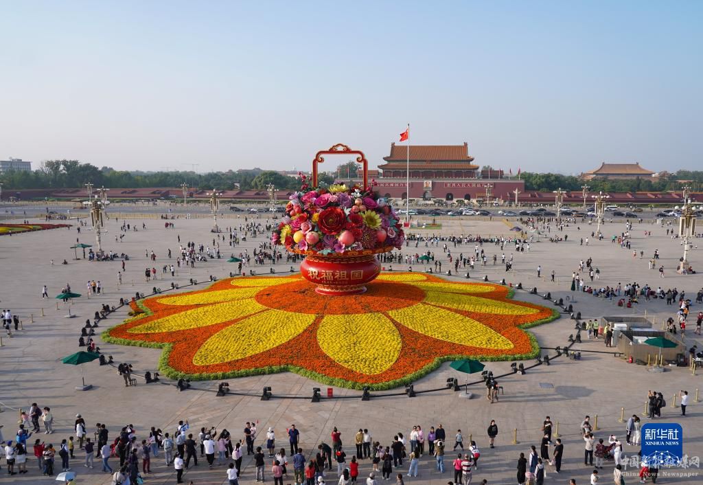 国庆节临近,“祝福祖国”巨型花果篮亮相北京天安门广场。今年“祝福祖国”巨型花果篮顶高18米,以喜庆的花果篮为主景,花坛底部直径48米。
