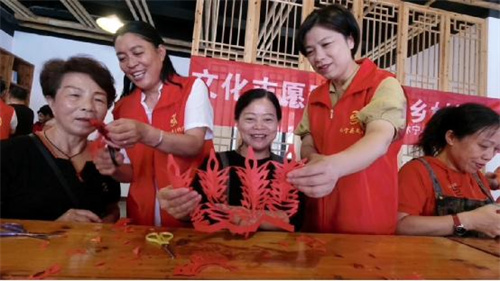 9月23日,休宁县文体旅局联合县文化馆组织文化志愿者,深入鹤城乡渔塘村开展剪纸艺术创作,用一张张剪纸作品展示丰收的喜人景象。
