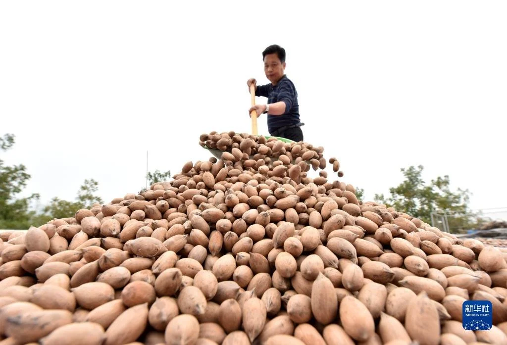 9月28日,在安徽省巢湖市夏阁镇,农户将采摘的薄壳山核桃集中堆放。金秋时节,田间地头一派繁忙,到处都是丰收的景象。新华社发(马丰成 摄)