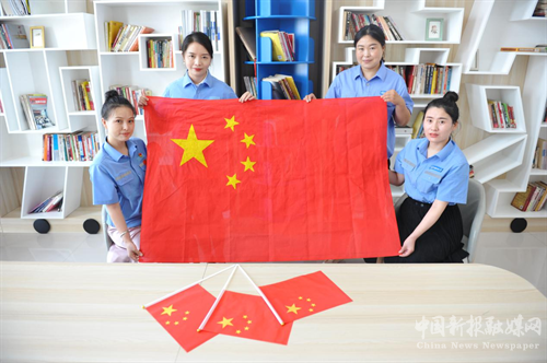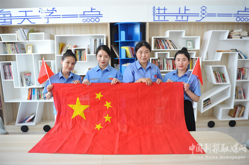 女职工与红旗合影