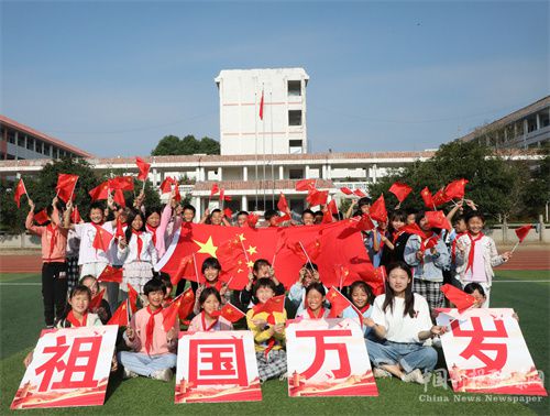 9月29日,在湖南省保靖县清水坪学校,学生与国旗合影喜迎国庆节。在国庆节来临之际,该校关工委组织开展“我和国旗合个影,我为祖国送祝福”主题教育活动,学生们通过和国旗合影、唱国歌、送祝福等方式表达对伟大祖国的热爱,喜迎国庆。(俞采华)