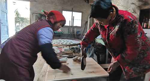 会用智能手机的村民忙碌之际不忘拍个抖音传播年俗风情,增添年的味道。.(程亮 盛红兵)