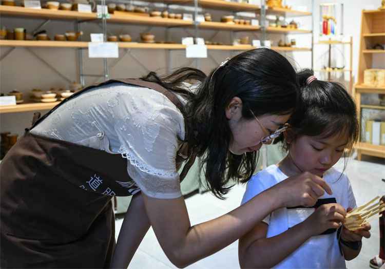 肖瑶在指导小朋友体验竹编。新华社记者 王曦 摄