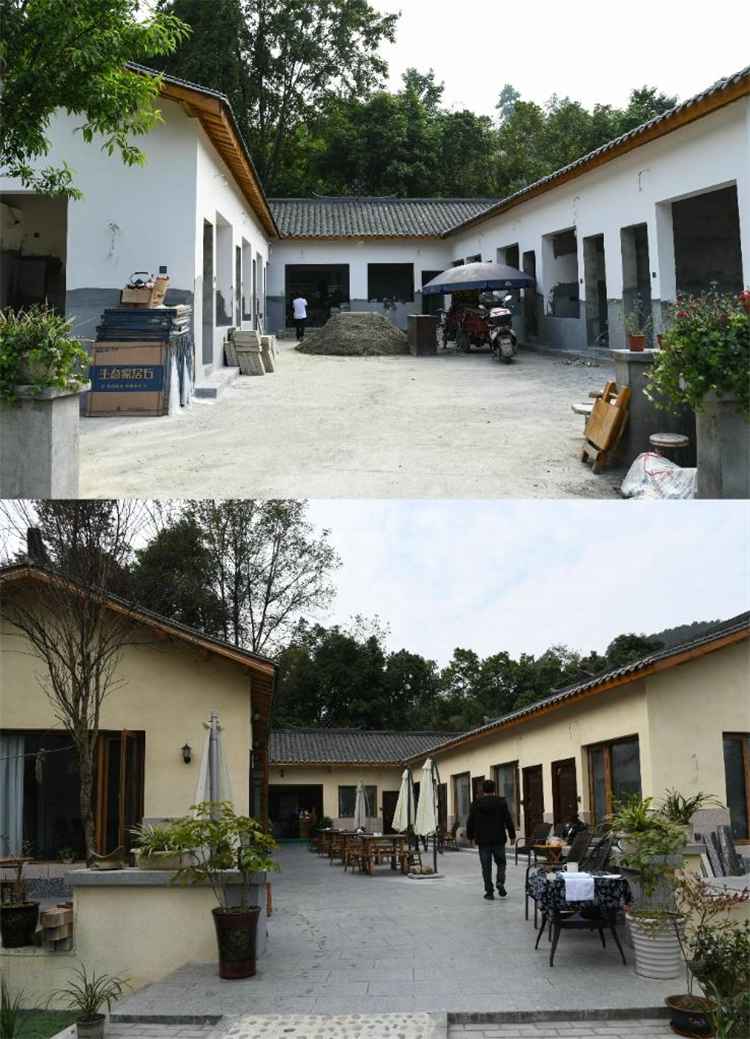 拼版照片:上图:任刚正在装修改造的房屋;下图:任刚家已改造成民宿。 新华社记者 王曦 摄