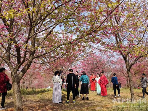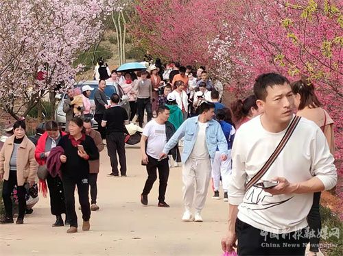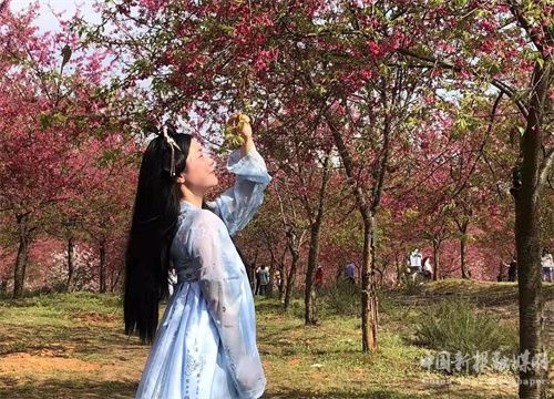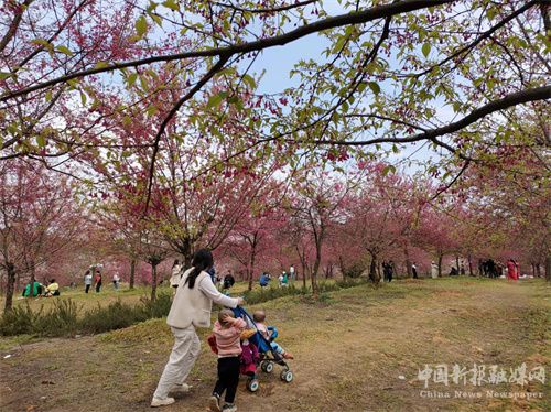踏上蜿蜒入园的游步道,便可看到如锦似缎的樱花儿绵延逶迤,红的似火、白的似雪、粉的若霞,与远处仿若实质的田园山林中升腾而起的迷雾轻烟共灼其华。路边间有青绿的迷迭香畦以及摇曳在青黄相间的杂草从中的小山花,被一拨又一拨放飞自我的红男绿女们摄入镜头,或被自拍同框。而你,也许会在某个不经意间变成另一个符号,在某个朋友圈或者九宫格中,变成一个印记或者一道风景……