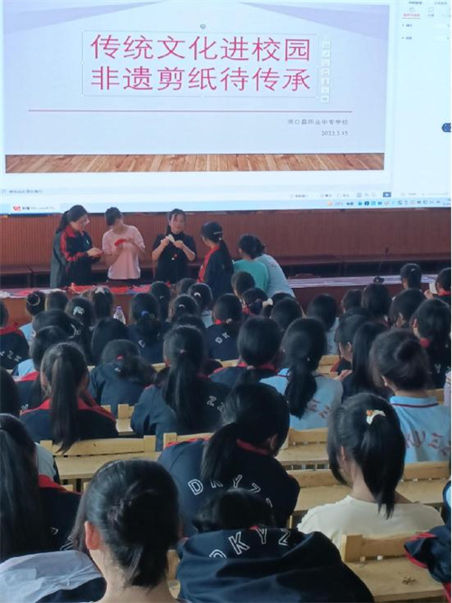 3月15日,湖南省洞口县汪氏剪纸第五代传承人汪阳华女士,应洞口县第一职业中学邀请,在该校多媒体教室开坛设讲,拉开了2022年度洞口县“非物质文化遗产进校园”系活动的序幕。