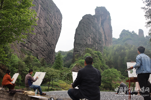 景区里,一群常来崀山采风写生的新宁籍美术爱好者正在潜心创作,美术名家们走过去兴致高昂地和他们切磋技艺,分析作品的风格特色、写意效果、作品优缺点。画与景,人与画,同成了一道靓丽的风景线。