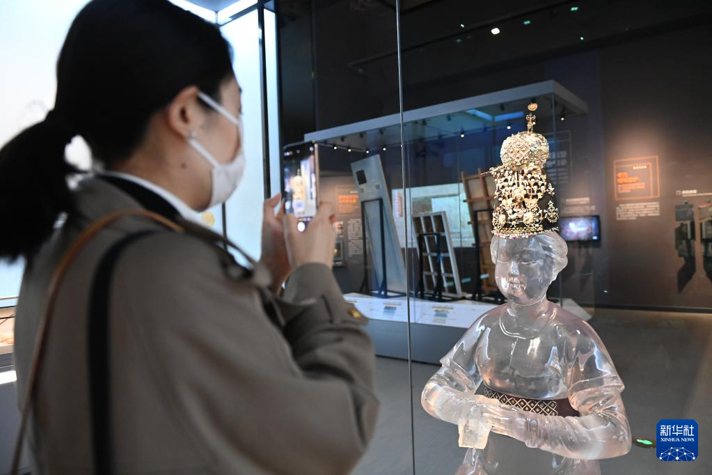 4月28日,游客在陕西考古博物馆内拍摄唐代李倕冠饰。